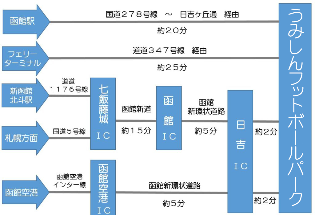 うみしんフットボールパークへの行き方。函館駅から車で約20分。フェリーターミナルから車で約25分。札幌方面、新函館駅方面からは車で函館新道・函館新環状道路を利用して七飯藤城ICから約22分。函館空港から車で函館新環状道路を利用して約7分。